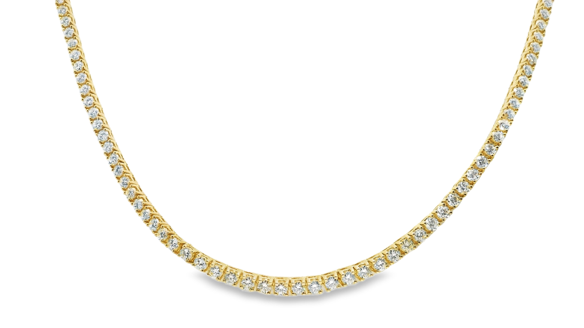 Elevate your collection with this 7.35-carat diamond half-way tennis necklace, expertly crafted in 14k yellow gold. Each diamond is securely set in a classic 4-prong setting, ensuring optimal light reflection and lasting brilliance. Designed for both elegance and durability, this refined piece offers timeless sophistication perfect for any occasion.