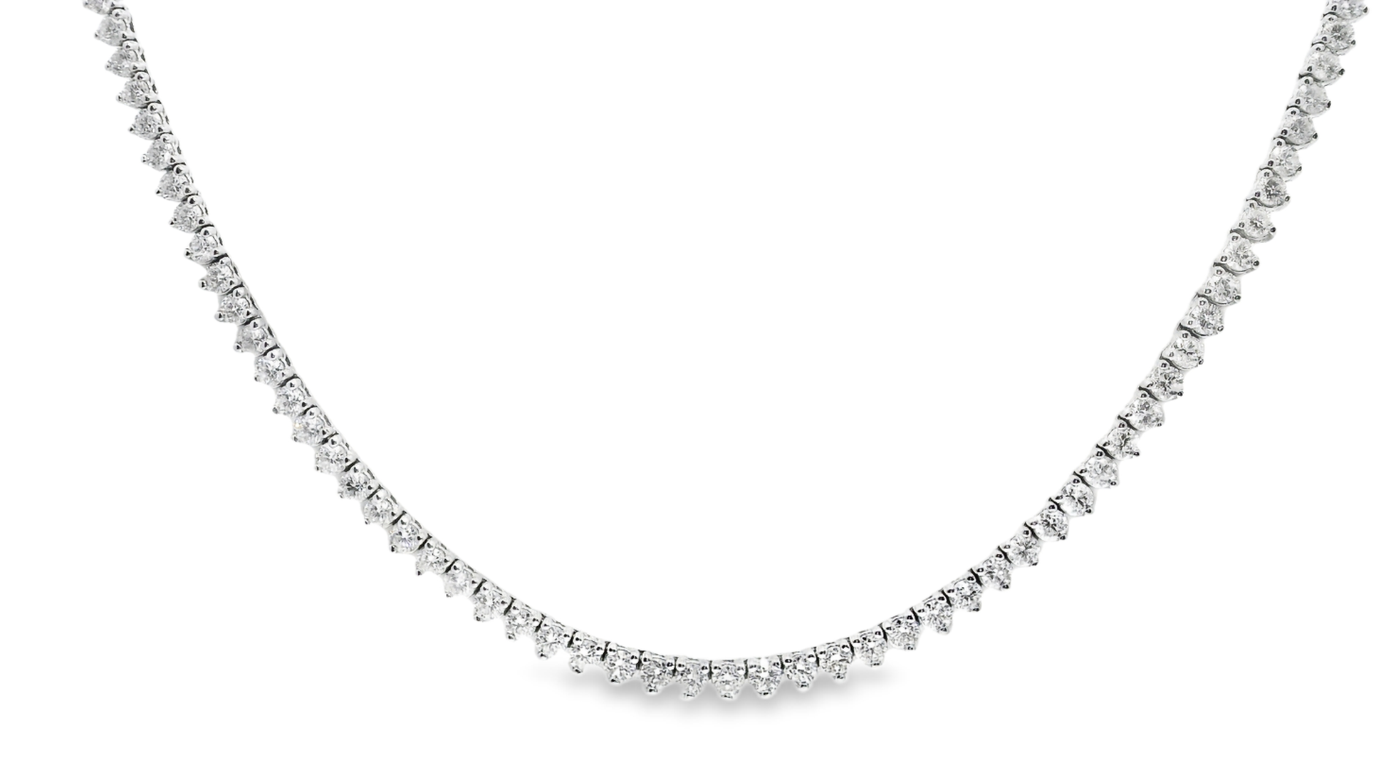 This exquisite 10.28-carat diamond necklace features expertly set stones in a classic three-prong design, crafted from 14k white gold for lasting brilliance and strength. Its elegant tennis style offers timeless sophistication while securely showcasing each diamond’s brilliance, making it an exceptional piece for refined occasions or everyday luxury.