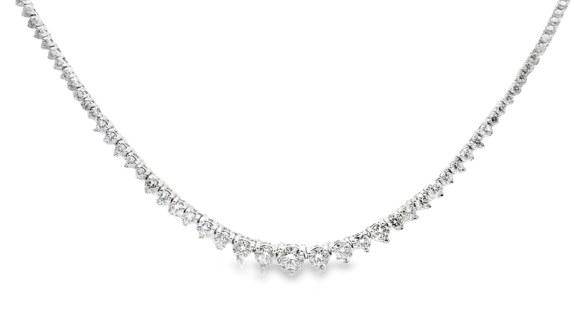 Elevate your elegance with this 5.48-carat diamond tennis necklace crafted in 14k white gold. The graduated design features expertly set diamonds in secure 3-prong settings, ensuring both brilliance and durability. Perfect for sophisticated occasions, this necklace offers a timeless sparkle that complements any outfit with refined craftsmanship and lasting quality.