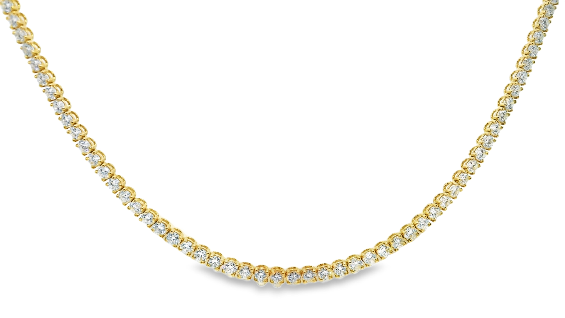 Elevate your collection with this expertly crafted 9.29-carat diamond tennis necklace, featuring securely set stones in classic 4-prong settings. Crafted from luminous 14k yellow gold, this piece offers enduring elegance and exceptional sparkle, perfect for sophisticated occasions or daily refinement. Its durable construction ensures lasting beauty while highlighting each diamond’s brilliance.