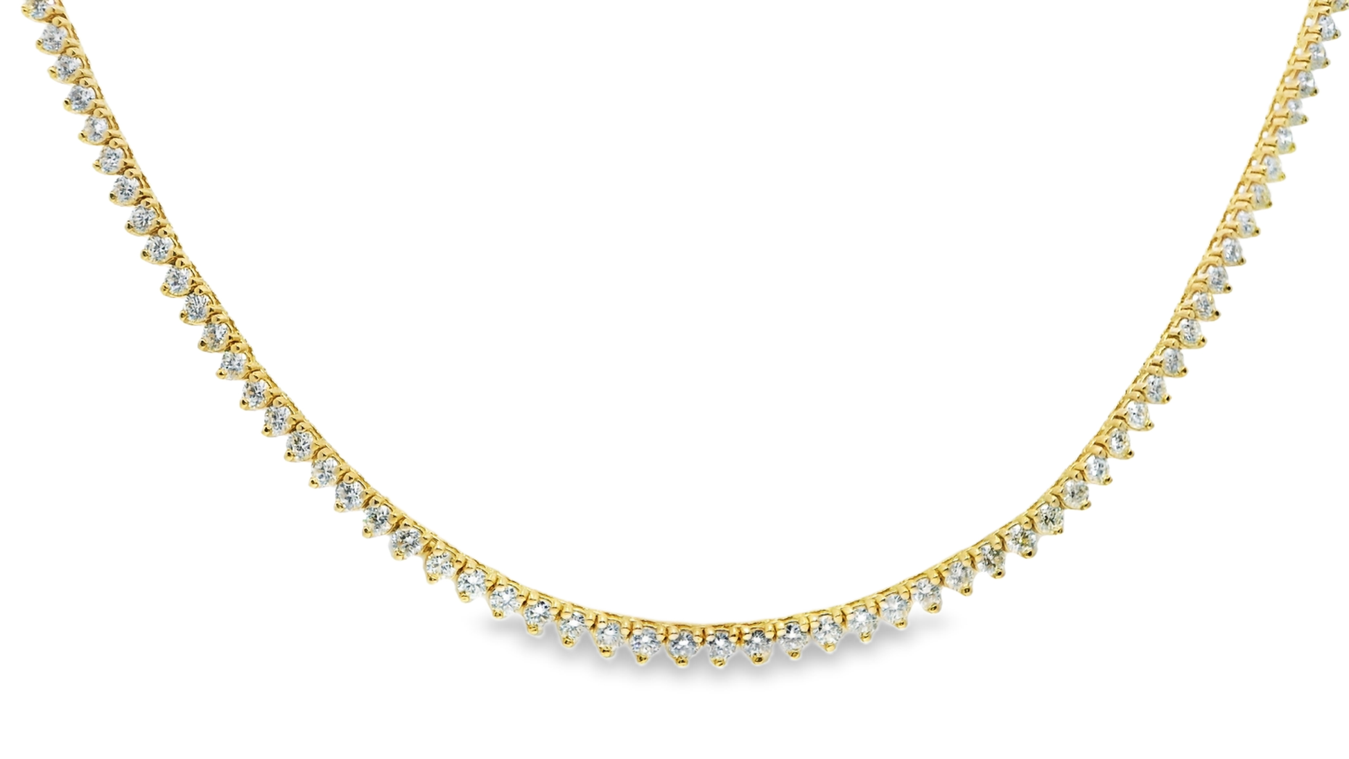 This exquisite tennis necklace features a total of 5.08 carats of round cut diamonds, each securely set with a classic 3-prong design to maximize brilliance. Crafted in 14K yellow gold, the piece balances timeless elegance with durable construction, making it a refined choice for those seeking a sophisticated statement of luxury.
